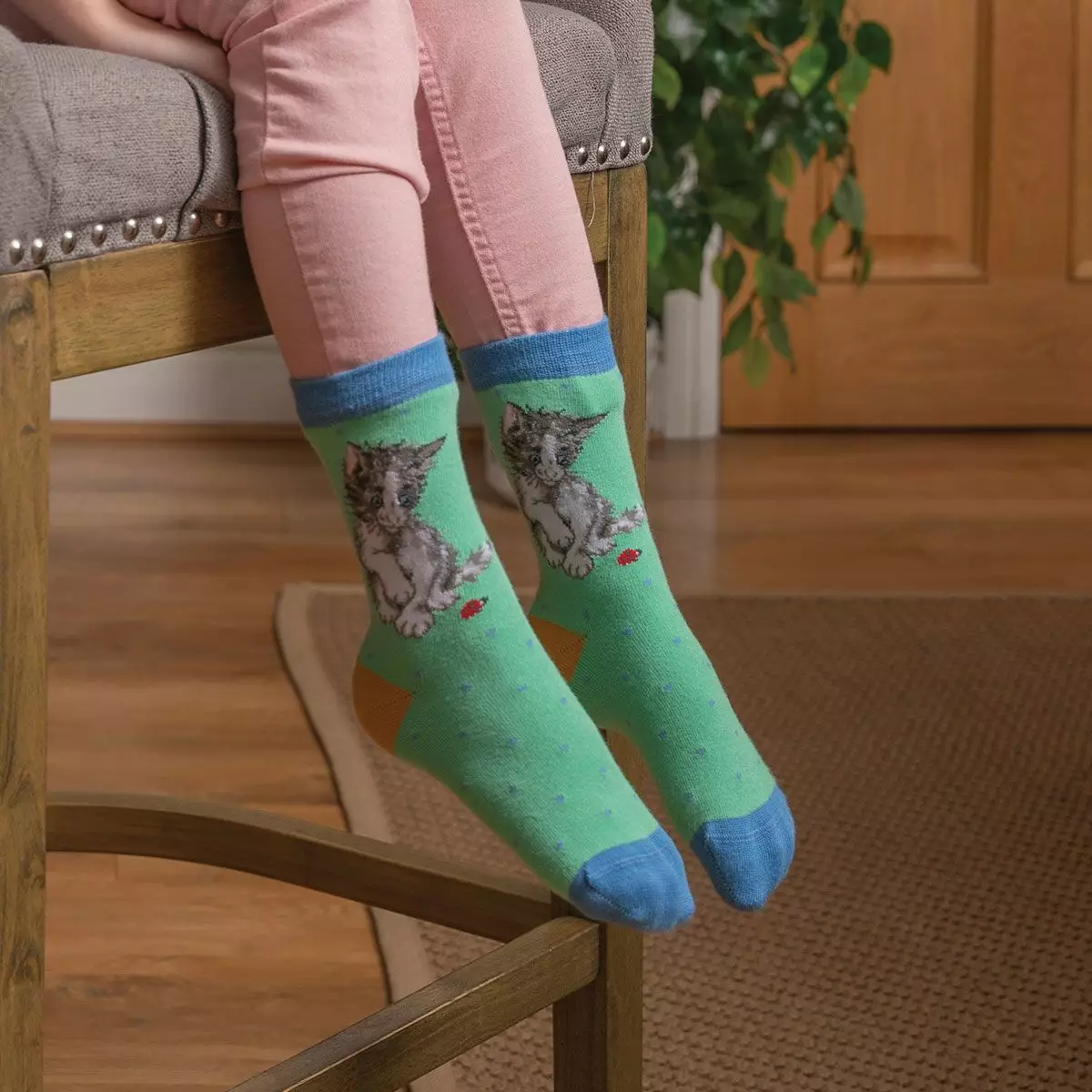 Ihanan pehmoinen lasten bambusukka Wrendalen kissa kuvituksella. Sukan pohjaväri on mintunvihreä ja siinä on keltainen kantapää, varren suu ja varpaat ovat siniset. Valittavanasi kaksi kokoa, 23-26 sekä 27-31.
