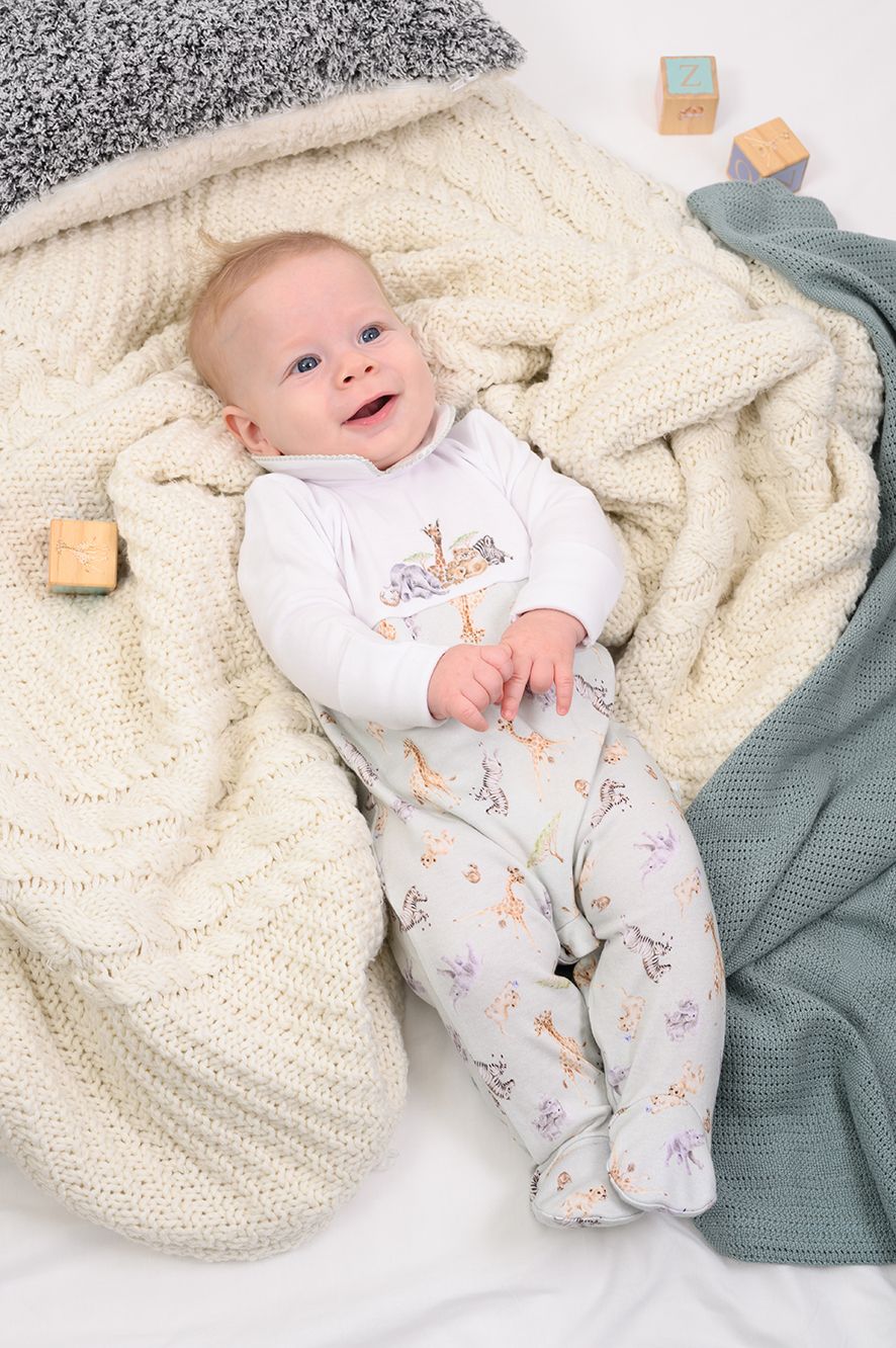 Suloinen vauvojen potkupuku, jossa on Wrendale Savanni kuviointi "Little Savannah" Afrikan eläimet. Potkupuvun yläosa on valkoinen ja etuosassa on suurehko savannin eläinpentujen kuva. Alaosa on hennon vaaleanvihreä ja siinä on useita erilaisia savannin eläinten. Pehmeässä potkupuvussa on pitkät hihat ja tyylikäs Peter Pan kaulus, jossa on vaaleanvihreä reunus. Potkupuvun takana ja haaroissa on kätevä nepparikiinnitys. Hihansuissa on käännettävät "tumput". 100% puuvilla. Konepesun kestävä. Juhlistaakseen uuden lapsen syntymää, Wrendale designs istuttaa puun jokaisesta ostetusta potkupuvusta yhteistyössä Eden Reforestation Projectin kanssa.