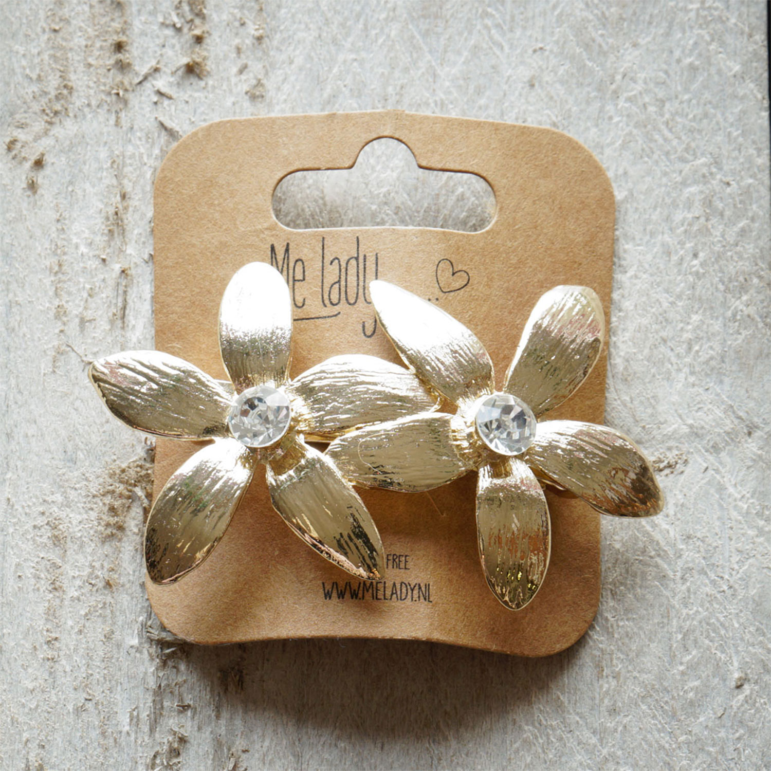 Kullanvärinen metallinen hiusklipsi kahdella kukalla, joissa timanttikoristeet. Mitat 8x4,5cm.