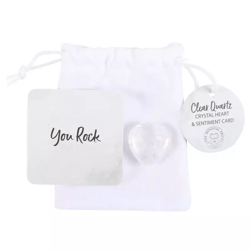 Kirkkaasta kvartsista valmistettu sydämenmuotoinen onnenkivi. Kirkas kvartsi kuvastaa puhtautta, selkeyttä ja rauhallisuutta. Sydän tulee kangaspussissa, jossa on myös "You Rock" -kortti.