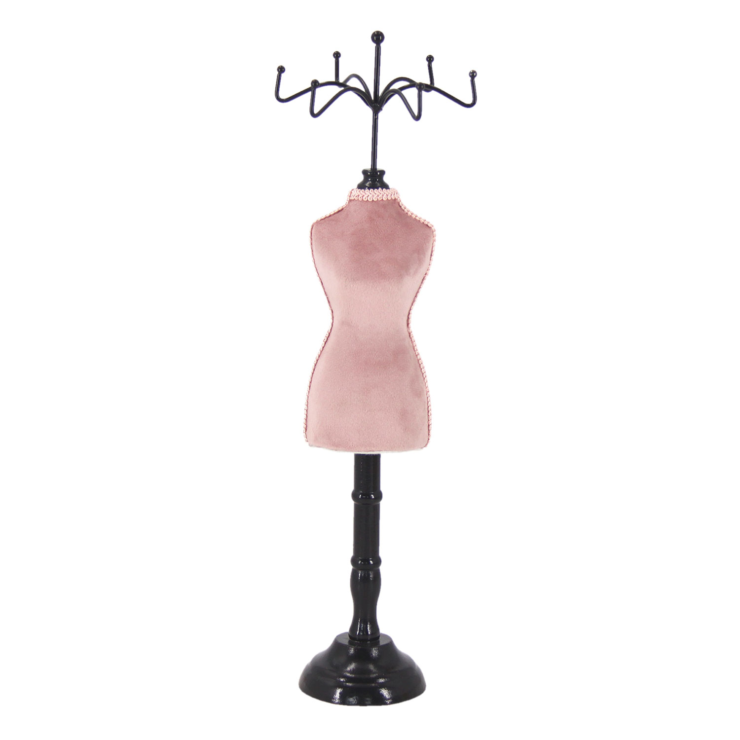 Samettisella vaaleanpunaisella kankaalla verhoiltu puinen mannekiinitorso koruteline. Mitat 39x12x10cm.