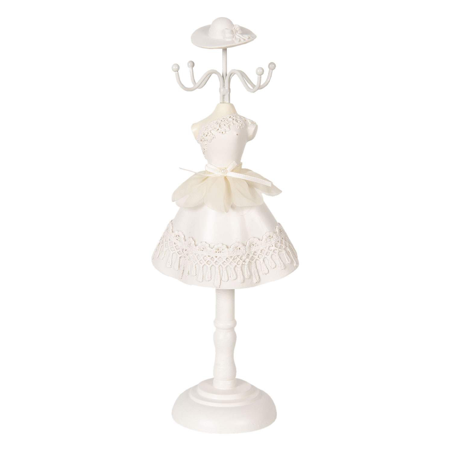 Kaunis valkoinen keraaminen mannekiinikoruteline puisella jalalla. Mekon vyötäröllä on kankainen koriste. Mitat 32x12x8,5cm.