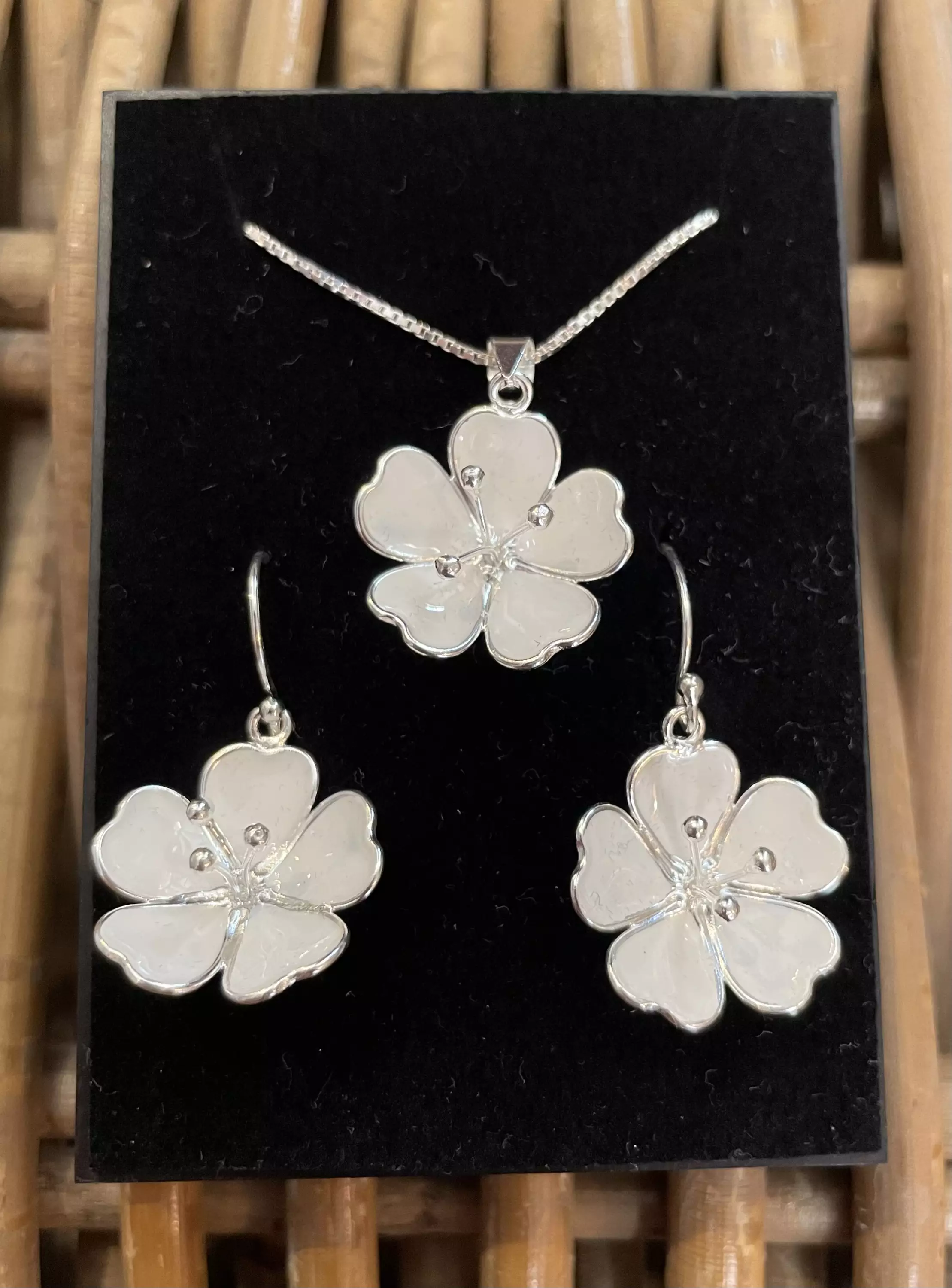 Lumikukka-korusetti. Roikkuvat korvakorut ja riipus. Kukan koko 19 mm, ketjun pituus 45 cm, 925 hopeaa.