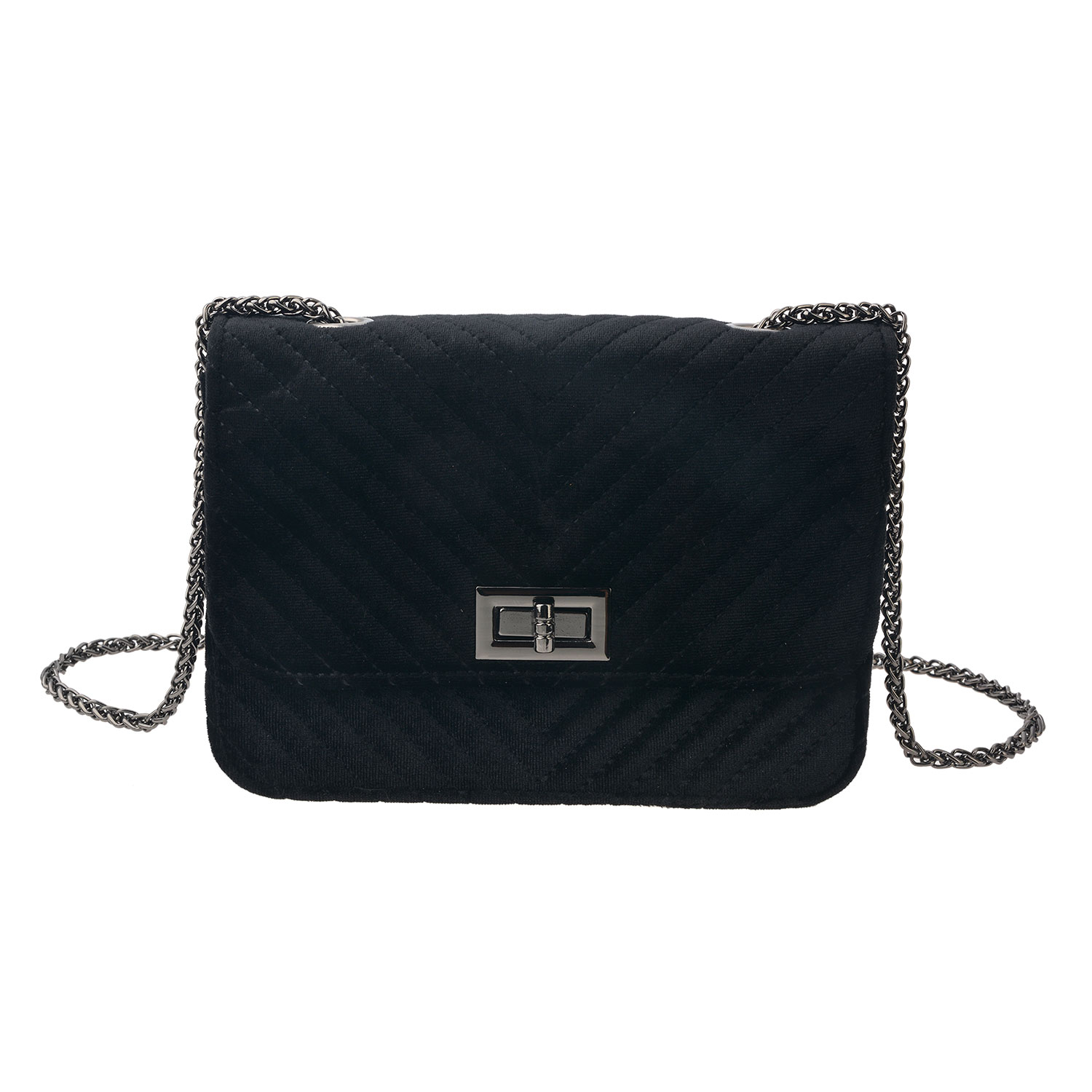 Musta pikkulaukku ketjuolkahihnalla. Pinta samettimainen. Sisällä kaksi lokeroa erotettu vetoketjutaskulla. Mitat 19x14x6cm.