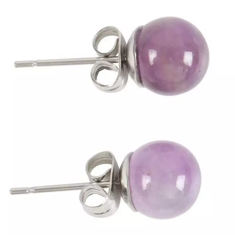 Ametistikivestä hiottu pyöreä korvakoru. Korun kiinnitysosat hopeaa. Kiven halkaisija on n. 8mm.