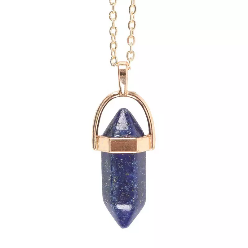 Lapis Lazuli -kvartsista tuplaobeliskinmuotoon hiottu koru. Metalliosat ovat ruostumatonta terästä.