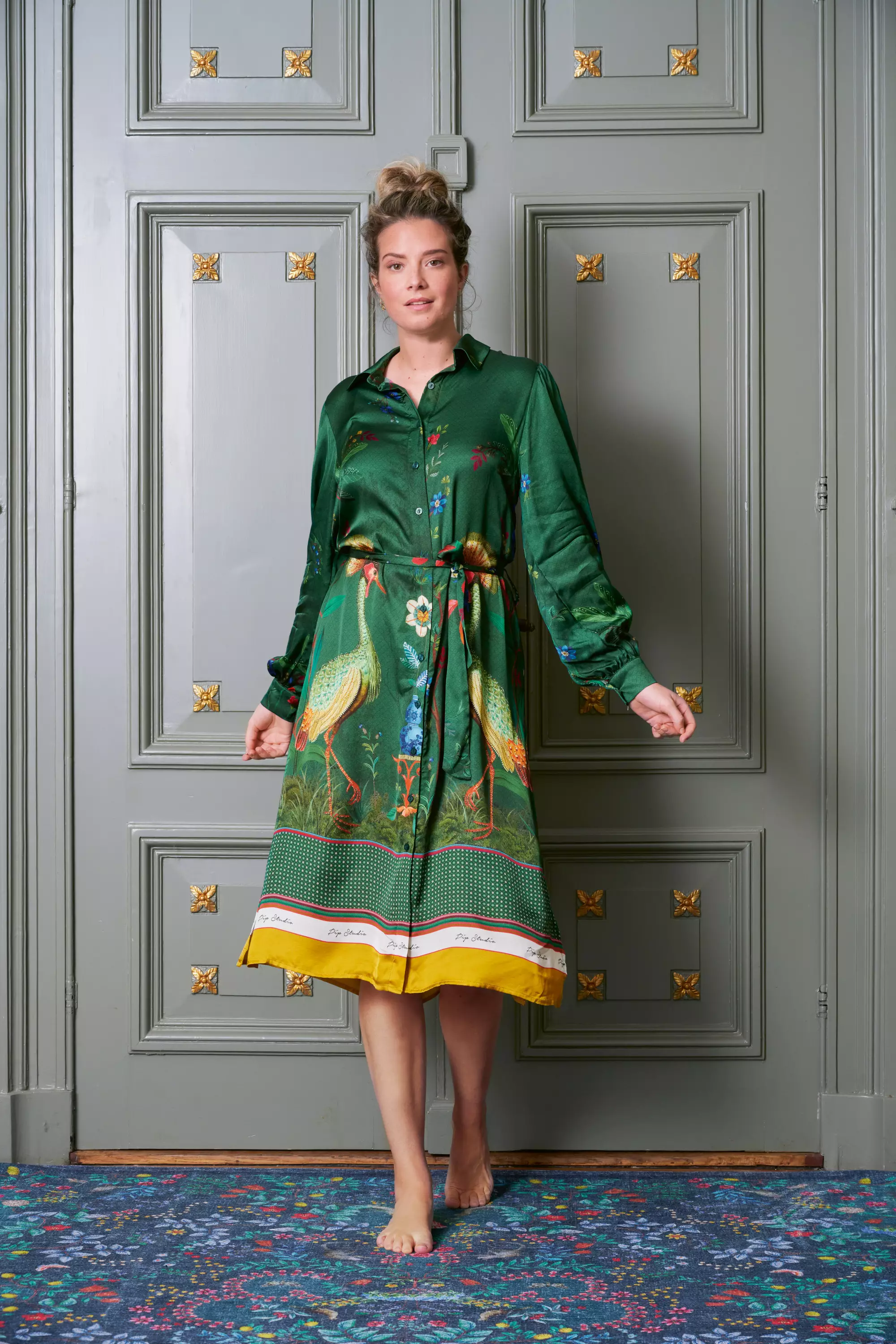 Tässä kauniissa vihreässä mekossa on kaksi kurkea, jotka katsovat toisiaan. Kurkien ympärillä kasvaa oksia ja kukkia. Elegantisti aseteltujen kukkien välissä on upeita palmuja. Mekon alaosa on koristettu reunuksella, jossa on tummia värejä ja kultainen raita.