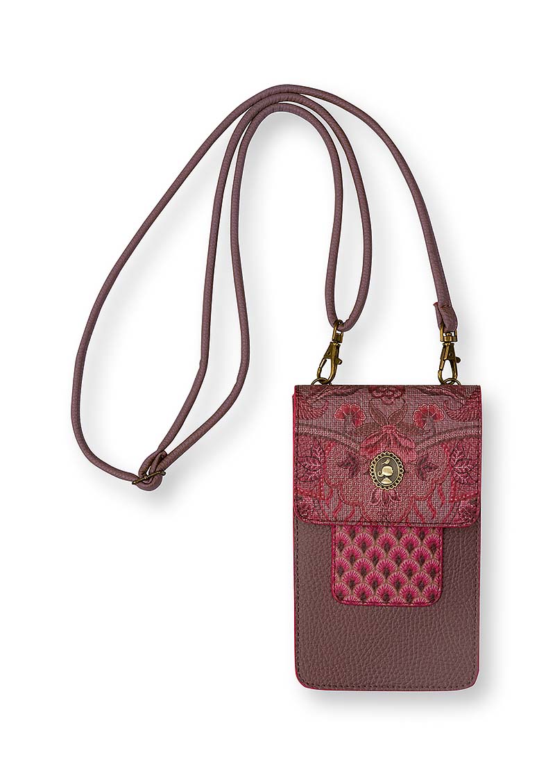 Tyylikäs puhelinlaukku jokapäiväiseen käyttöön. Puhelinlaukku / olkalaukku on koristeltu mielikuvituksellisilla sintsi kukilla ja lehdillä. Puhelinlaukkuun mahtuu puhelin ja siinä on paikka kortille. Laukussa on säädettävä olkahihna. Laukku suljetaan magneetti napilla. Laukku on tehty tekonahkasta. Koko 11 x 18 x 1 cm