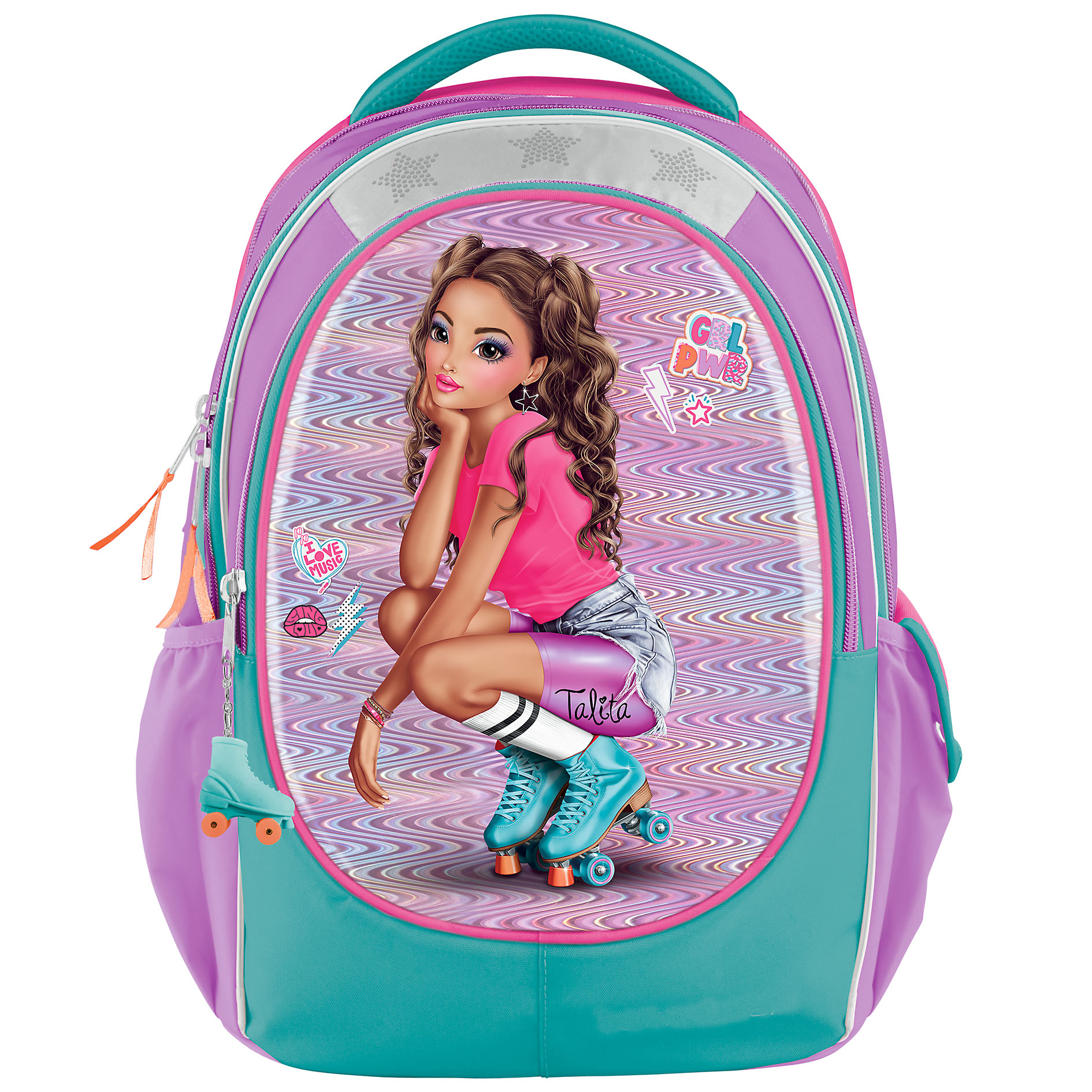 Tukeva ja kaunis Top Model rullaluistelija reppu. Reppu on jaettu kolmeen osaan ja sisältä löytyy useita lokeroita sekä paikat kynille. Repun toisella sivulla on tarrakiinnityksellä oleva pikkutasku ja toisella avotasku esim. juomapullolle. Repun hihnoissa ja selkäosassa on hengittävät pehmusteet. Repun voi kiinnittää rinnan kohdalta tukevoittamaan kantamista. Takana on pieni vetoketjullinen lisätasku. Hihnoissa on heijastinnauhat lisäämässä näkyvyyttä pimeällä. Pohja on likaa ja vettä hylkivä. Repun koko on 23x34x44 cm ja vetoisuus 19,6 l. Paino 990 g. Materiaali 100% polyesteri.