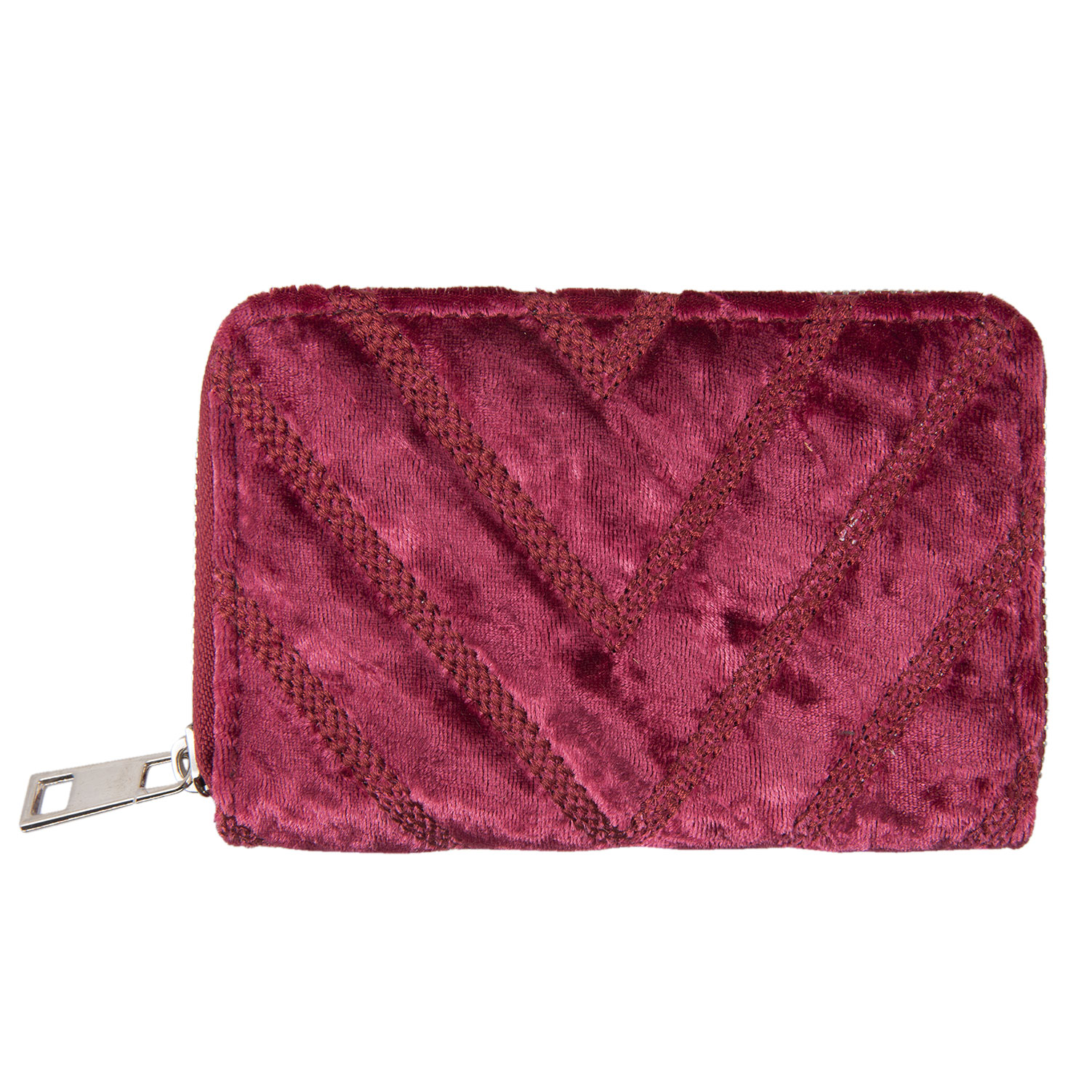 Burgundinpunainen vetoketjullinen lompakko samettimaisella pinnalla. Sisäpuoli musta. Neljä korttipaikkaa, kaksi avolokeroa ja pieni vetoketjullinen lokero. Mitat 13x9x2,5cm.