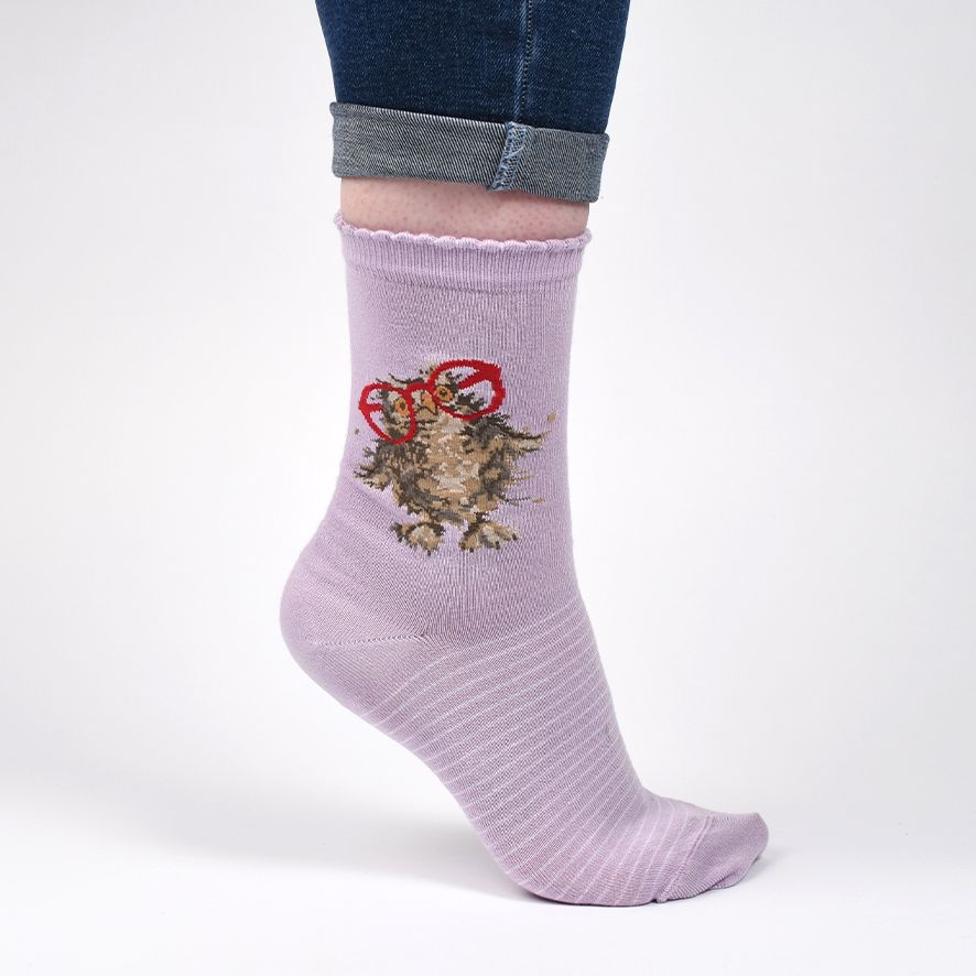 Suloiset ja ihanan pehmeät Wrendale yhden koon (n. 36-40) bambusukat. Sukan varressa höpsähtänyt silmälasipöllö kuvitus ja jalkaterän alueella kapea raidoitus. Sukan pohjaväritys on violetti. Materiaali: 75,6 % Bambu viskoosi, 23 % Polyamidi, 1,4% elastaani. Konepesu 40°C
