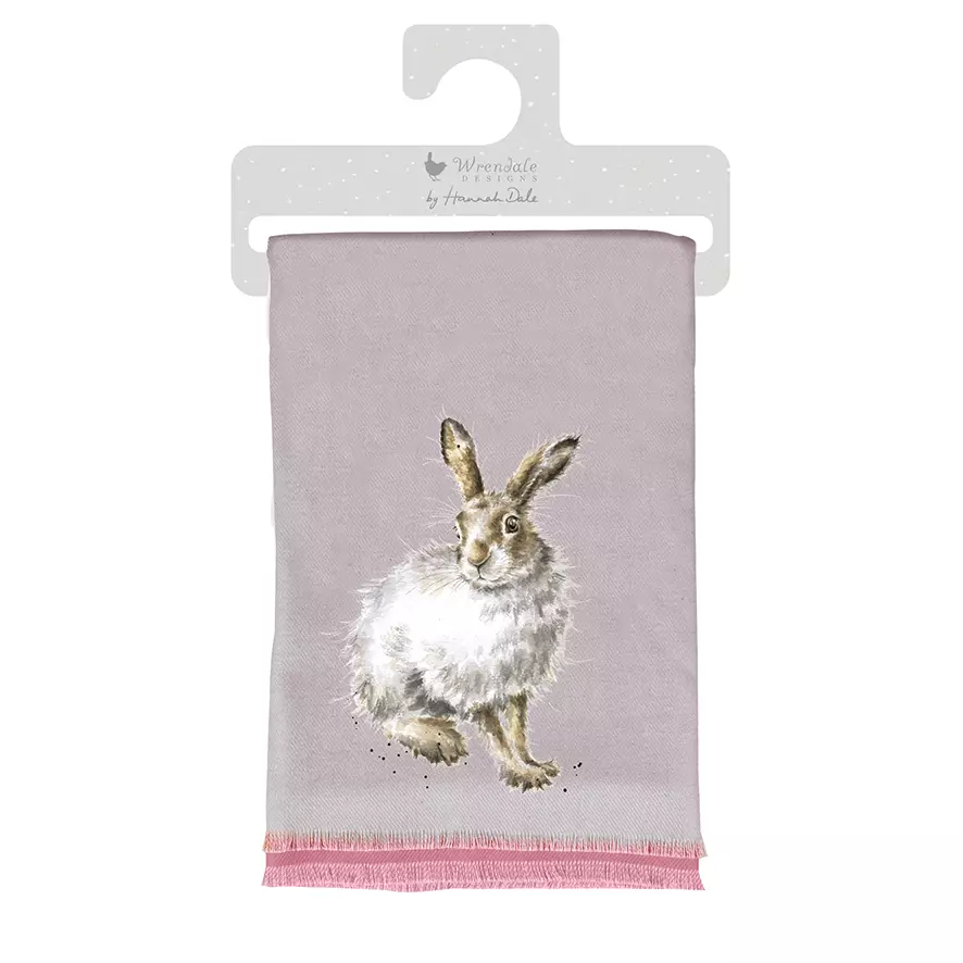 Ihanan pehmeä ja lämmittävä huivi Wrendalen tutulla jäniksen kuvalla. Kuva huivin molemmissa päissä. Kuvallinen puoli lila, toinen puoli vaaleanpunainen.