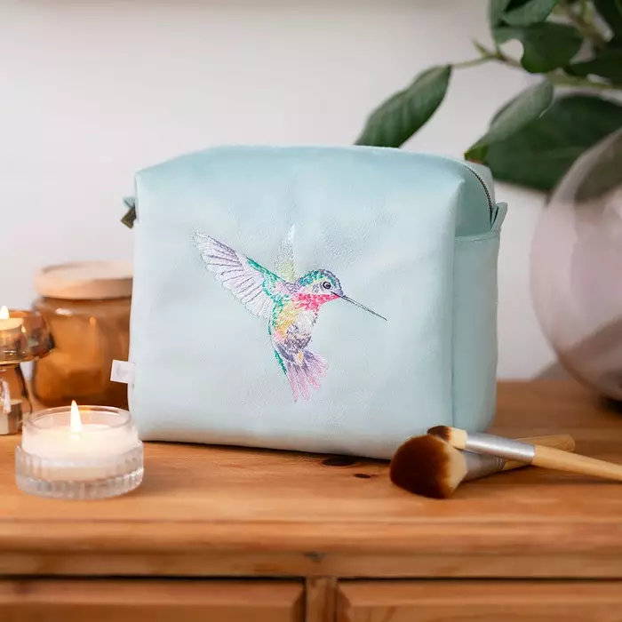 Upea Wrendale kosmetiikkalaukku, jossa brodeerattu kolibri "Wisteria wishes". Laukun pinta on pehmeää samettimaista materiaalia. Laukun sisällä on pieni tasku.