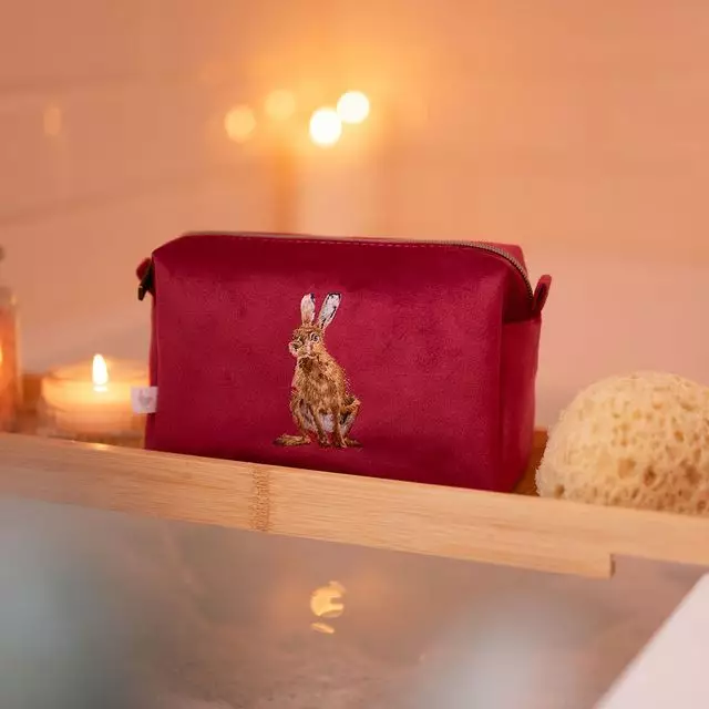 Upea Wrendale meikkilaukku, jossa brodeerattu jänis "Golden hour". Laukun pinta on pehmeää samettimaista materiaalia. Laukun sisällä on pieni tasku.