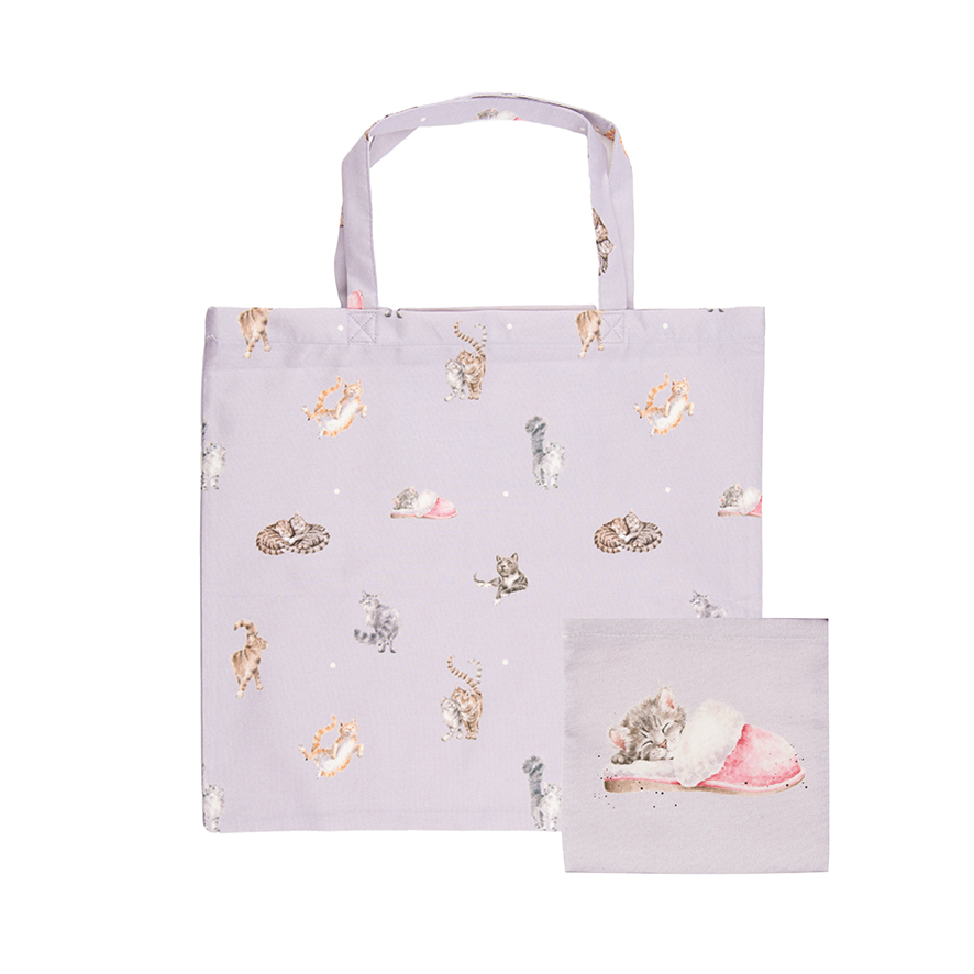 Wrendalen ihastuttava taiteltava ostoskassi. Ostoskassin sisällä on pieni tasku, johon kassin voi näppärästi taittaa. Taskussa iso kuva kissasta nokosilla tohvelissa, kassissa on useampi pienempi kissakuva.