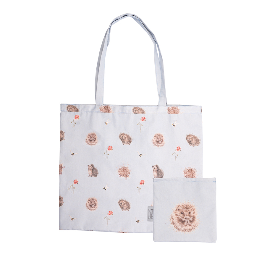 Wrendalen ihastuttava taiteltava ostoskassi. Ostoskassin sisällä on pieni tasku, johon kassin voi näppärästi taittaa. Taskussa iso kuva siilistä, kassissa useampi pienempi kuva.